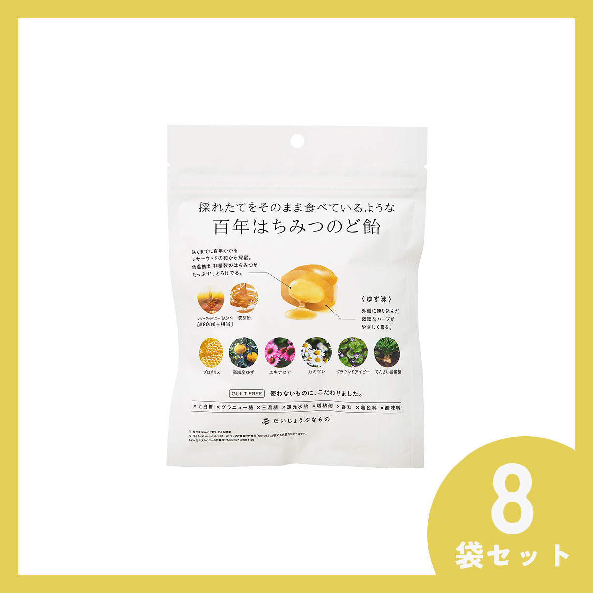 百年はちみつのど飴(レザーウッドハニー + ハーブキャンディ)<ゆず味>【8袋セット】