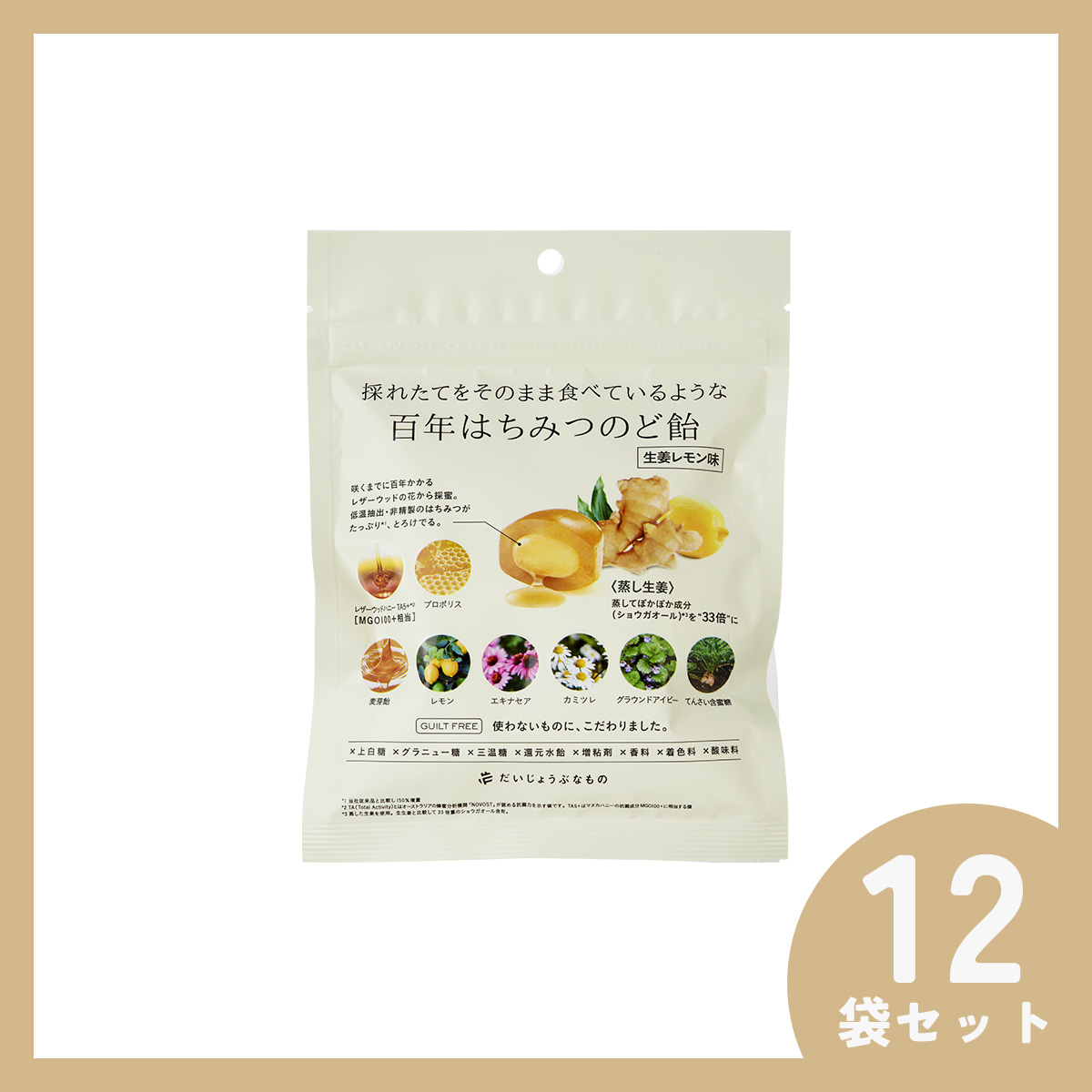 百年はちみつのど飴(レザーウッドハニー + ハーブキャンディ)<生姜レモン味>【12袋セット】