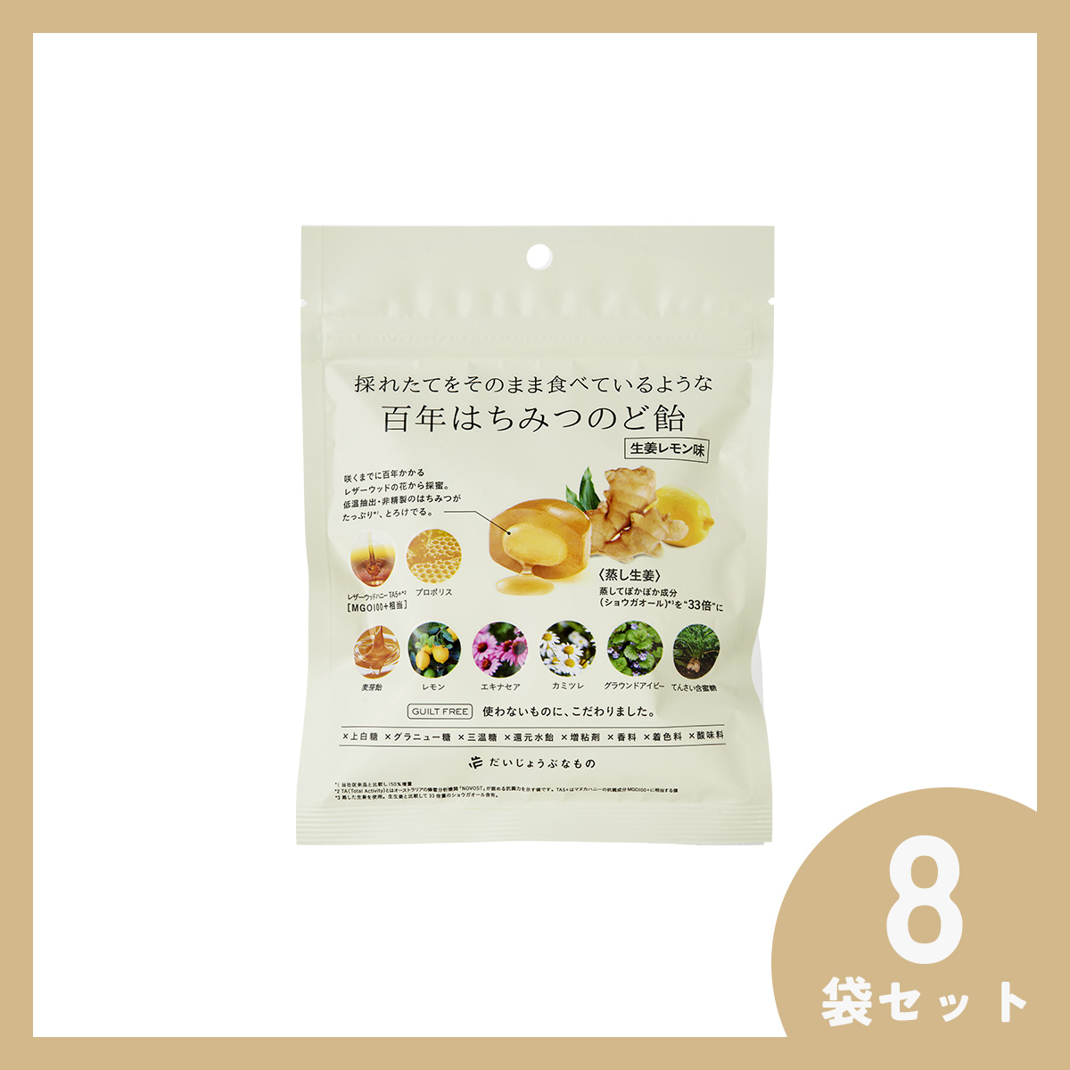 百年はちみつのど飴(レザーウッドハニー + ハーブキャンディ)<生姜レモン味>【8袋セット】