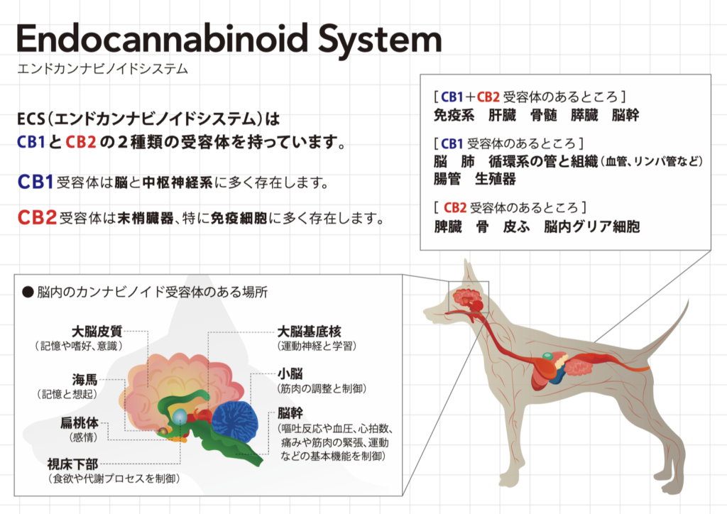 前述の通り、私たち人間や犬猫などは、内因性カンナビノイドを身体から分泌し、ECS(エンドカンナビノイドシステム)の受容体に結合させ、健康のバランスを保っています。